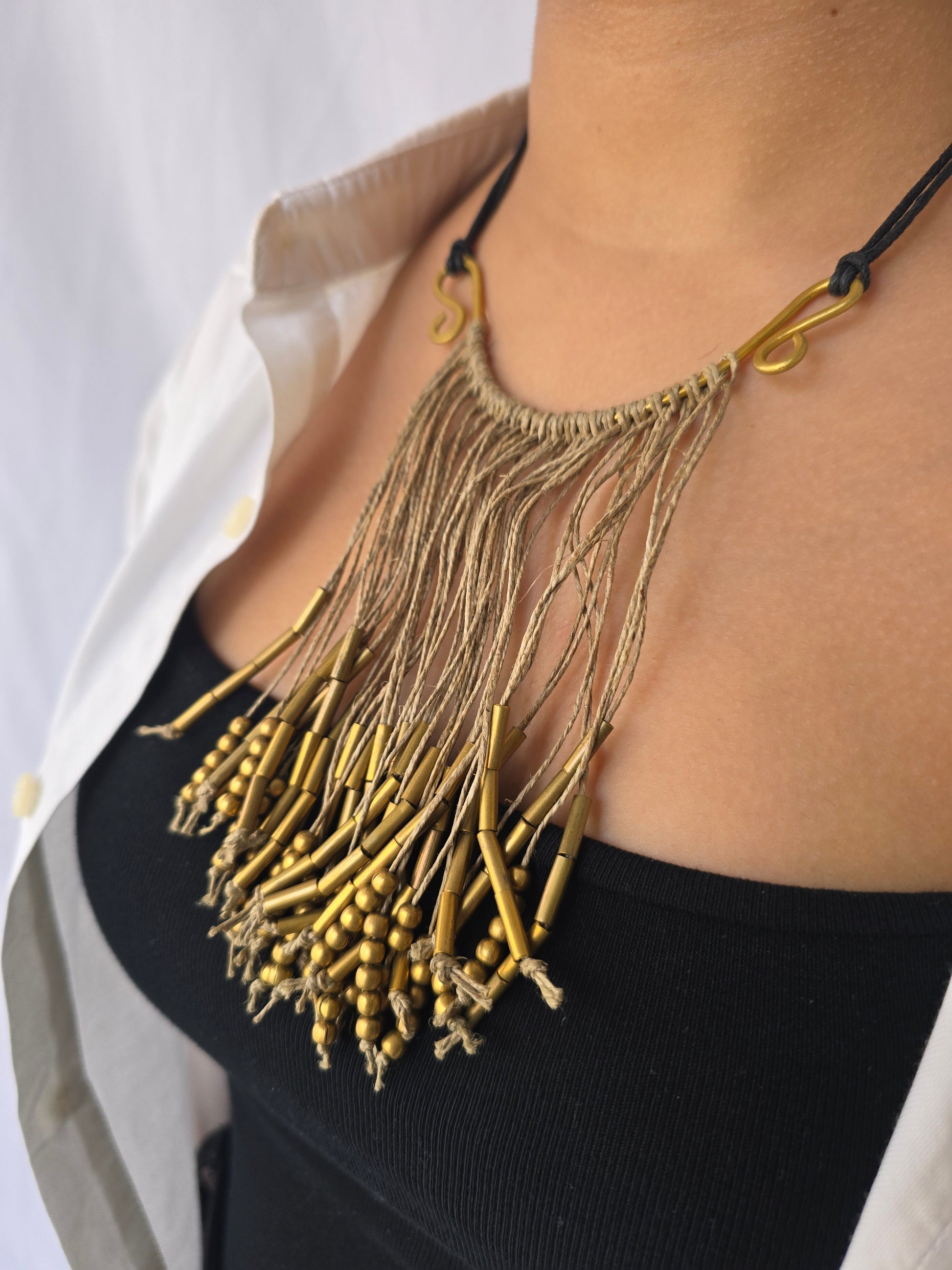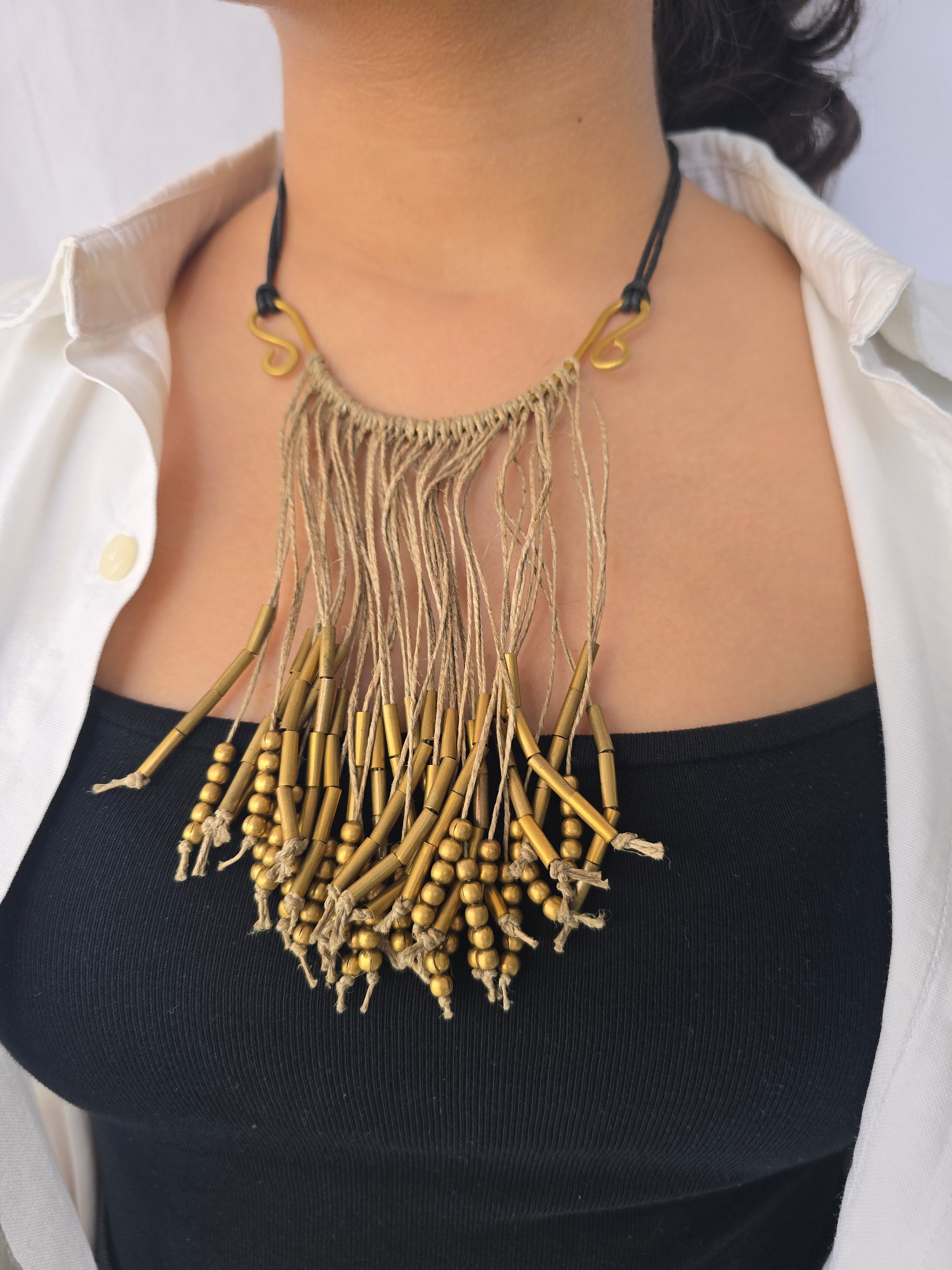 The Bar Necklace with Jute Thread is a distinctive piece of handmade jewelry. This handcrafted brass necklace features a sleek brass bar combined with rustic jute thread, creating a unique blend of elegance and natural texture. Perfect for adding a touch of artisanal charm to any outfit.
