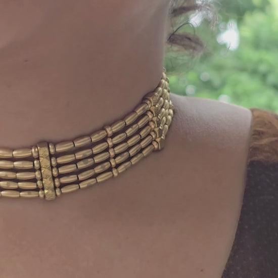 Minimal yet striking, this handcrafted brass choker features rows of elongated beaded detailing arranged in a structured, layered design. Its clean and bold look makes it a versatile piece—perfect for pairing with both traditional attire and contemporary outfits. With its timeless golden finish, this choker can be worn solo for a refined statement or layered with charms for a more festive appeal.