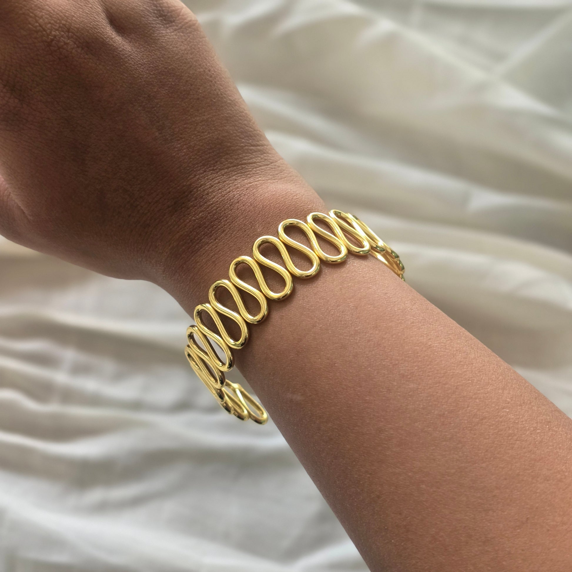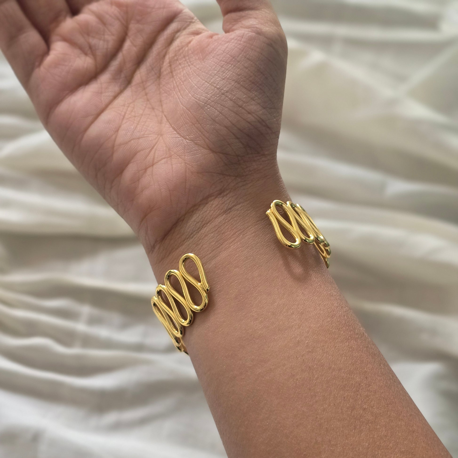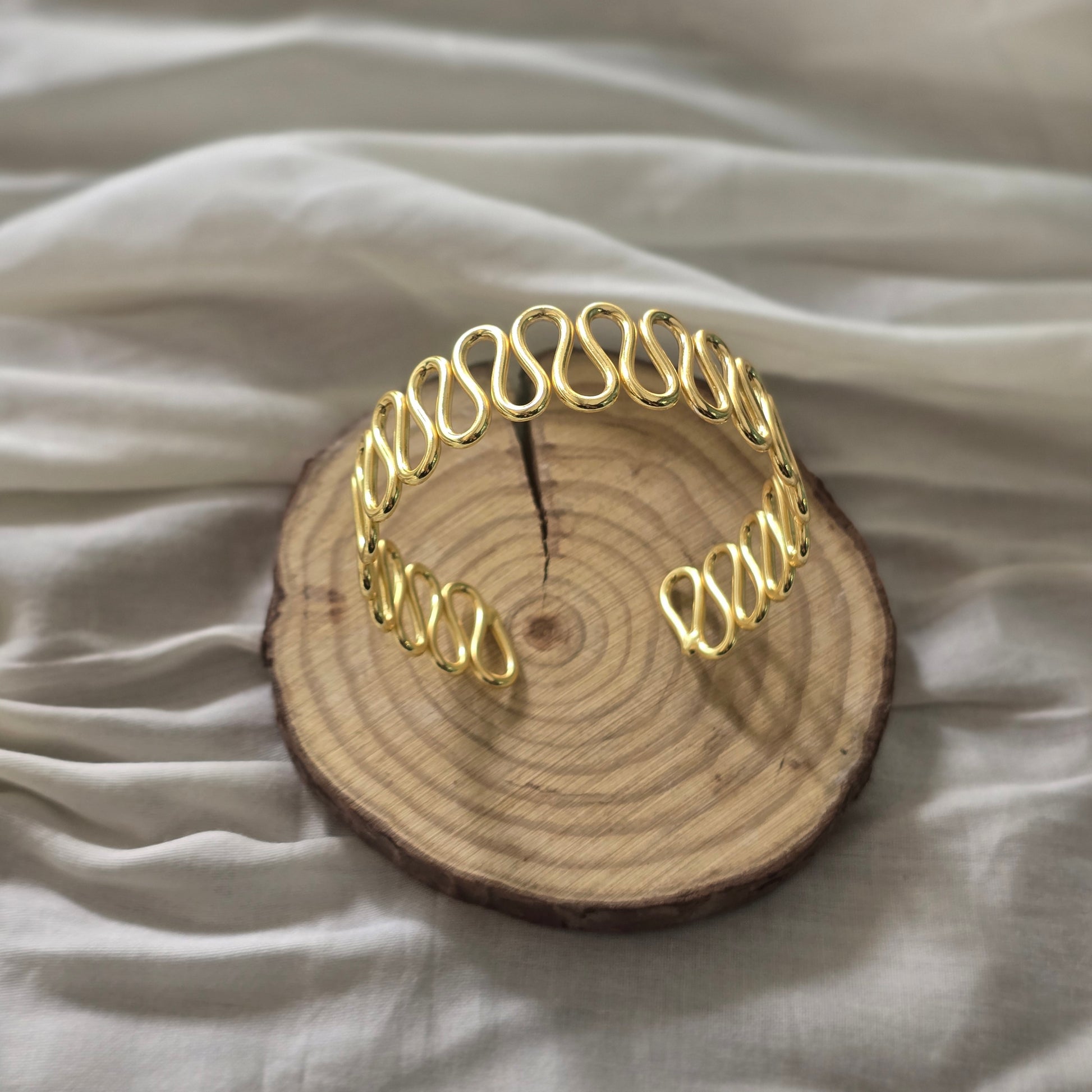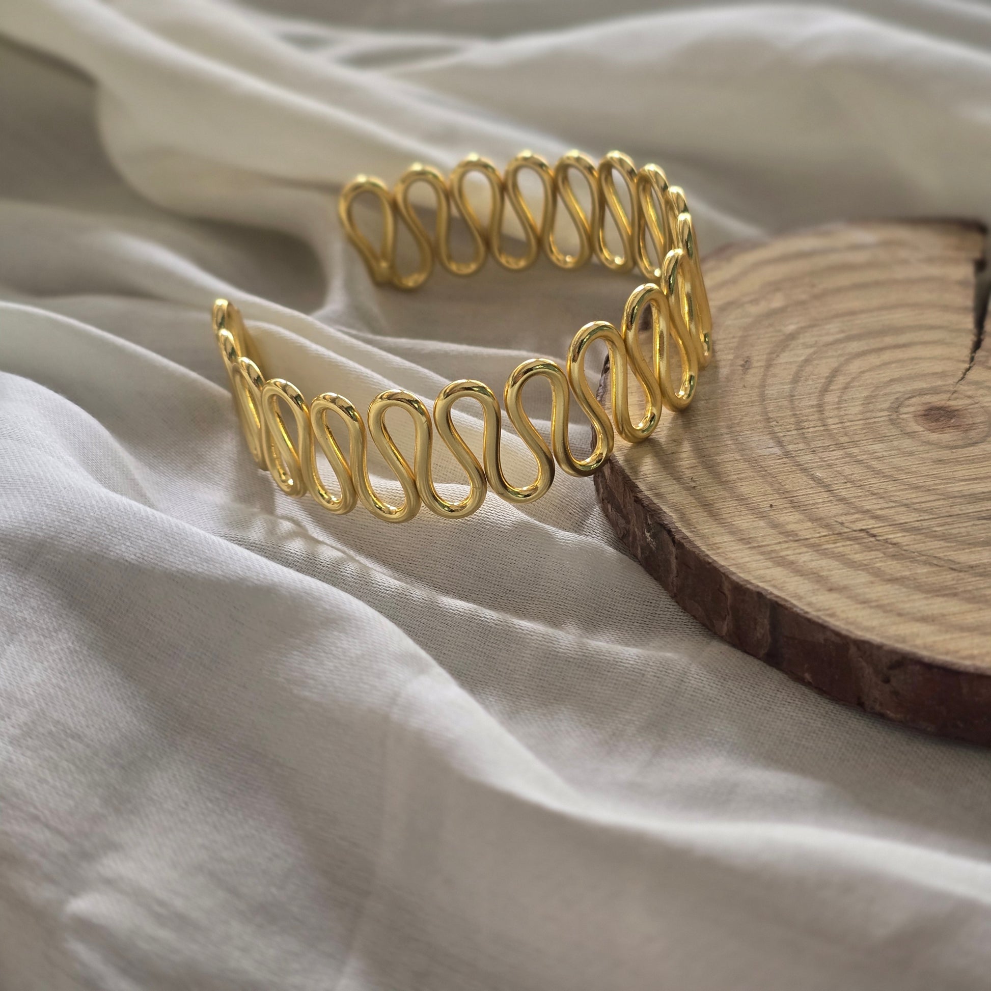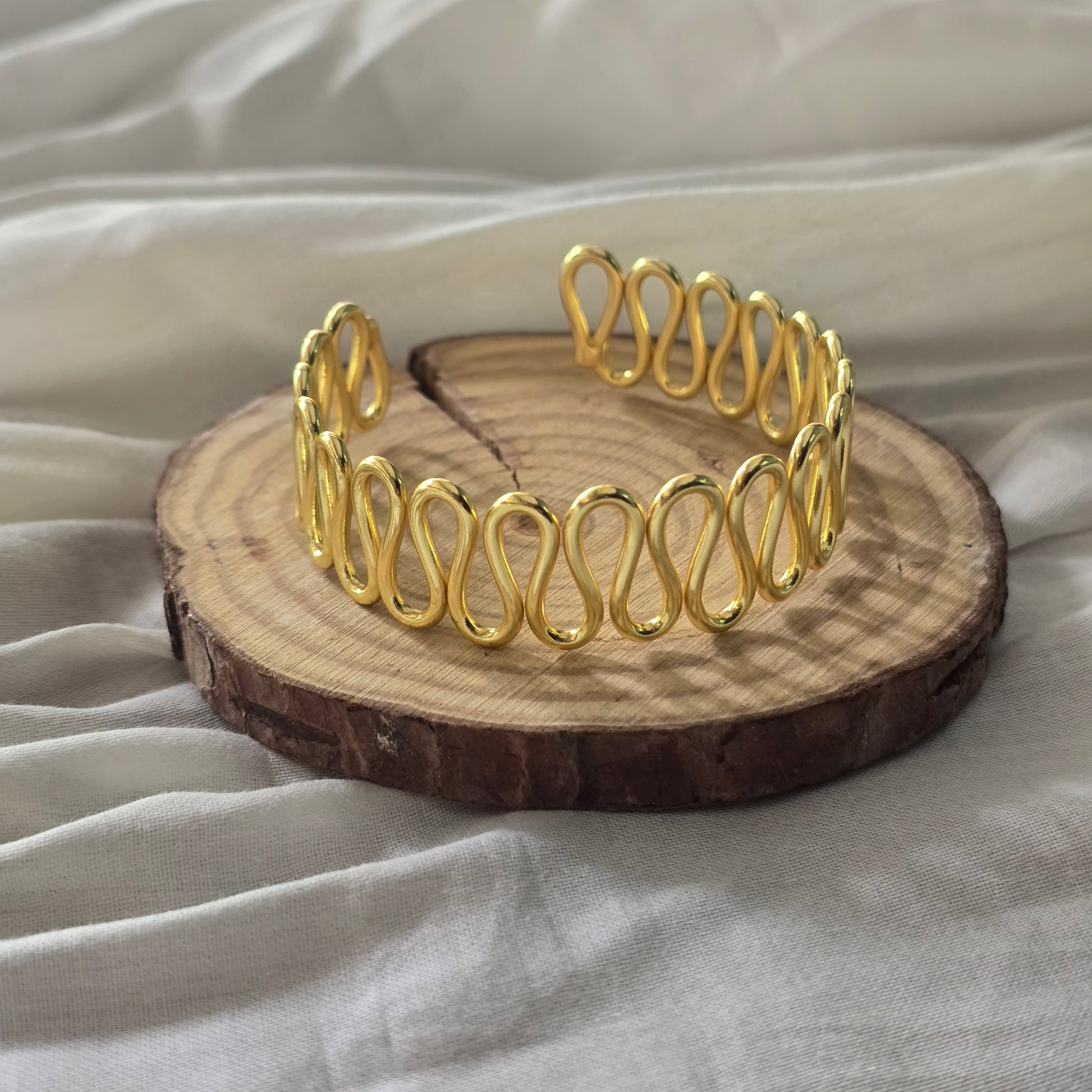 levate your style with this handcrafted bracelet featuring a fluid wave design that wraps gracefully around your wrist. Made from pure brass and finished with high-quality gold plating, this statement piece balances modern design with timeless elegance. Lightweight yet striking, it’s perfect for both daily wear and special occasions.