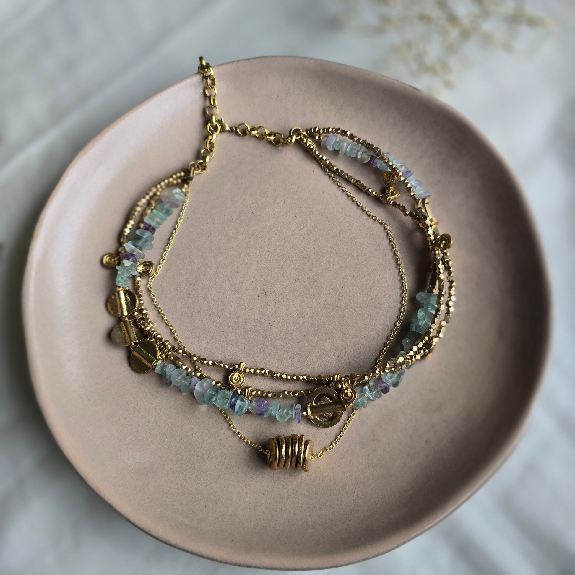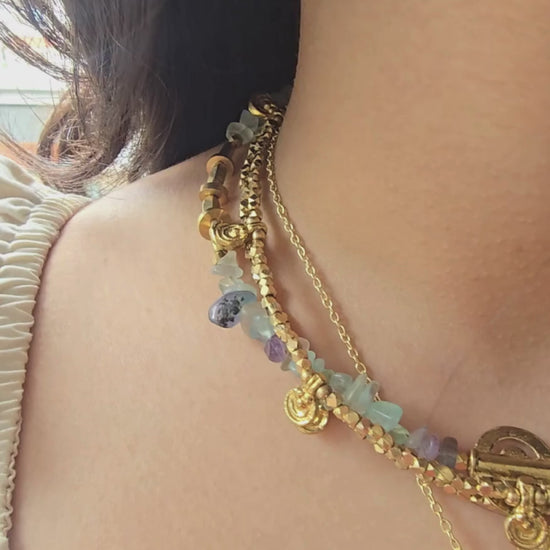 Handcrafted with translucent green fluorite stones and rustic brass details, this multi-strand beauty balances elegance with grounding charm. A serene statement piece that brings clarity and calm to your everyday look.