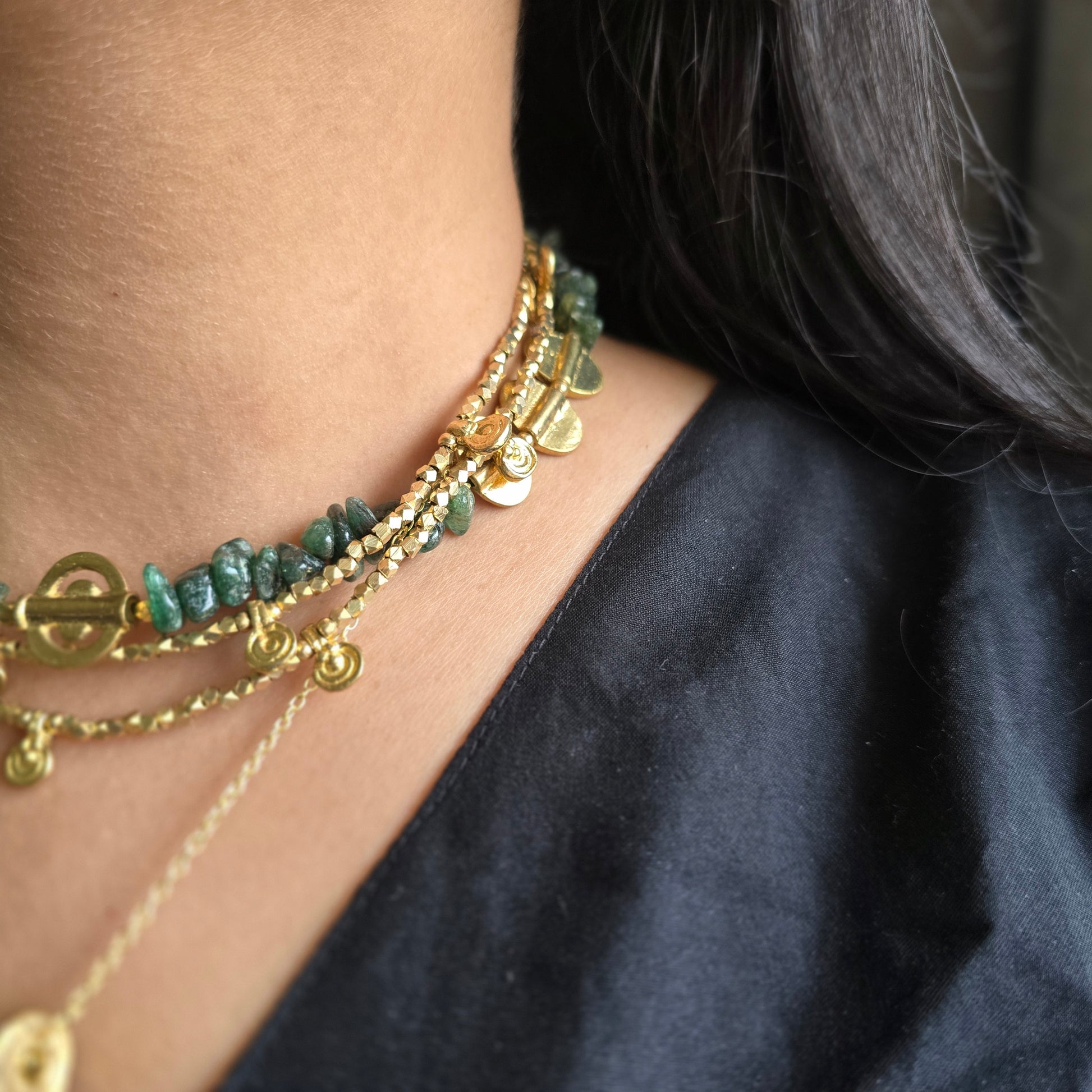 Blends earthy charm with bold elegance. Featuring layered strands of green-hued beads and rustic brass elements, it captures the essence of harvest and harmony. A statement piece that adds freshness and a grounded glow to your ethnic or contemporary looks.