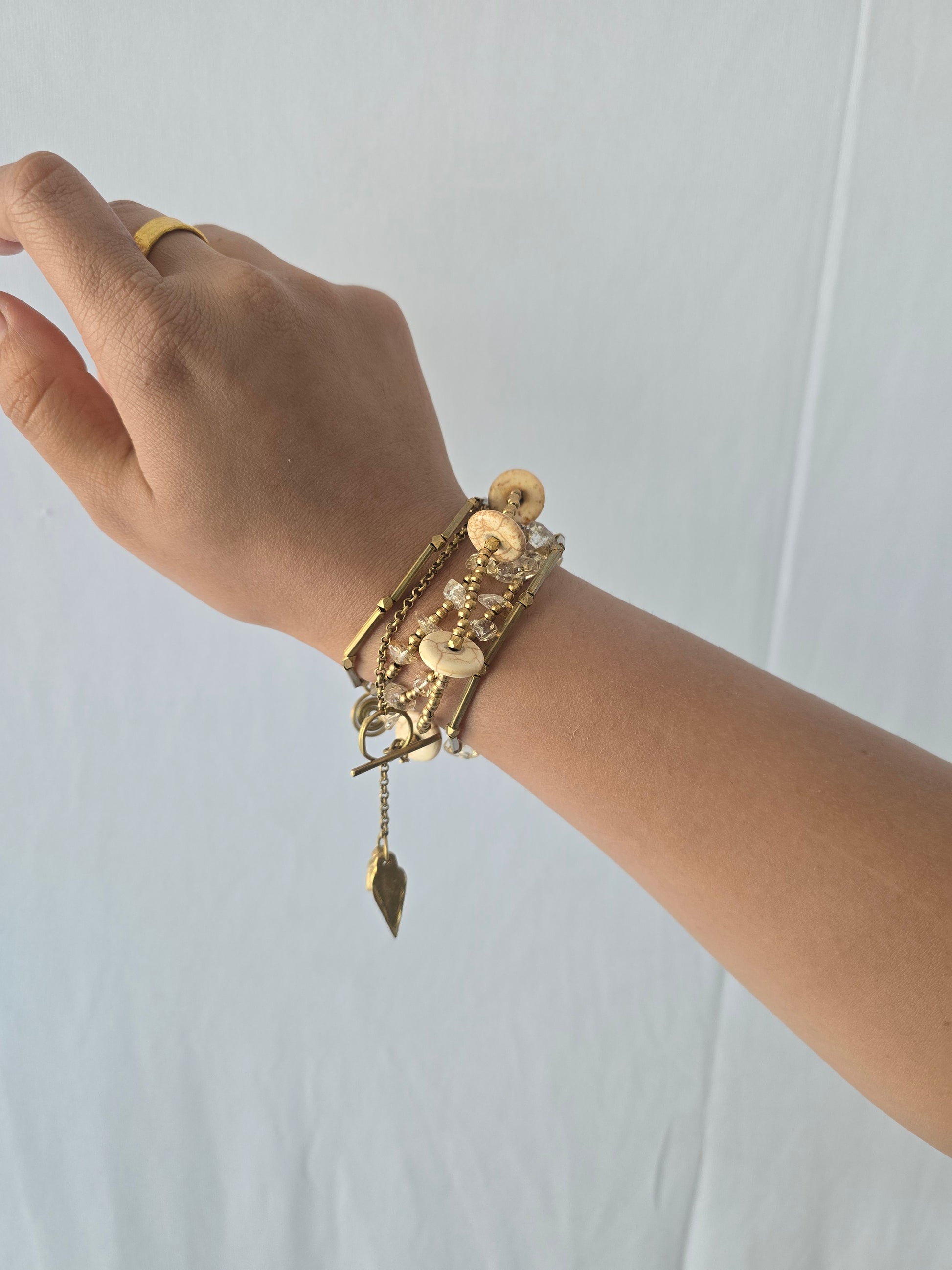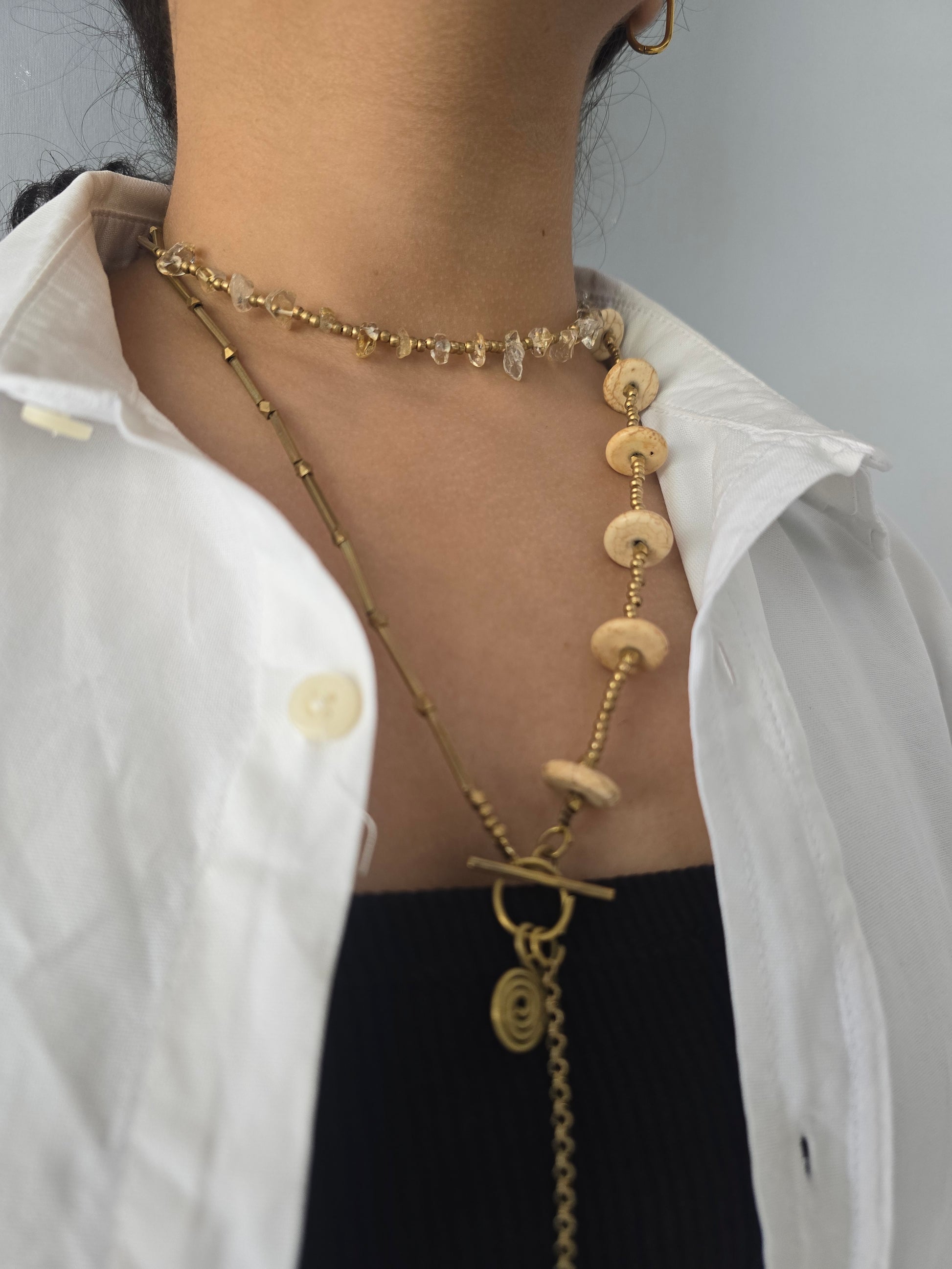 Soft, radiant, and endlessly versatile—the Ivory Drift Modular Jewelry Strand is a refined take on bohemian luxe. Handcrafted with creamy ivory-toned beads, delicate crystals, and antique-finish brass chain links, this piece beautifully blends organic warmth with elegant shimmer.