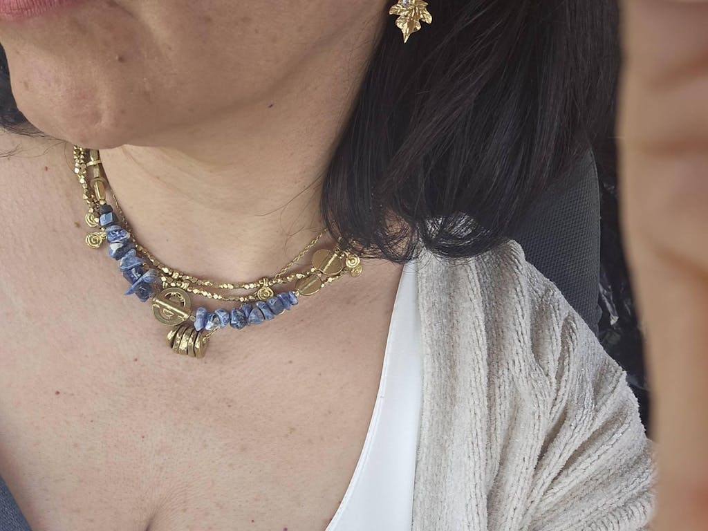 Featuring rich blue lapis stones paired with warm brass accents. This multi-strand design blends celestial hues with earthy charm, making it a perfect statement piece for both festive wear and mindful everyday styling.