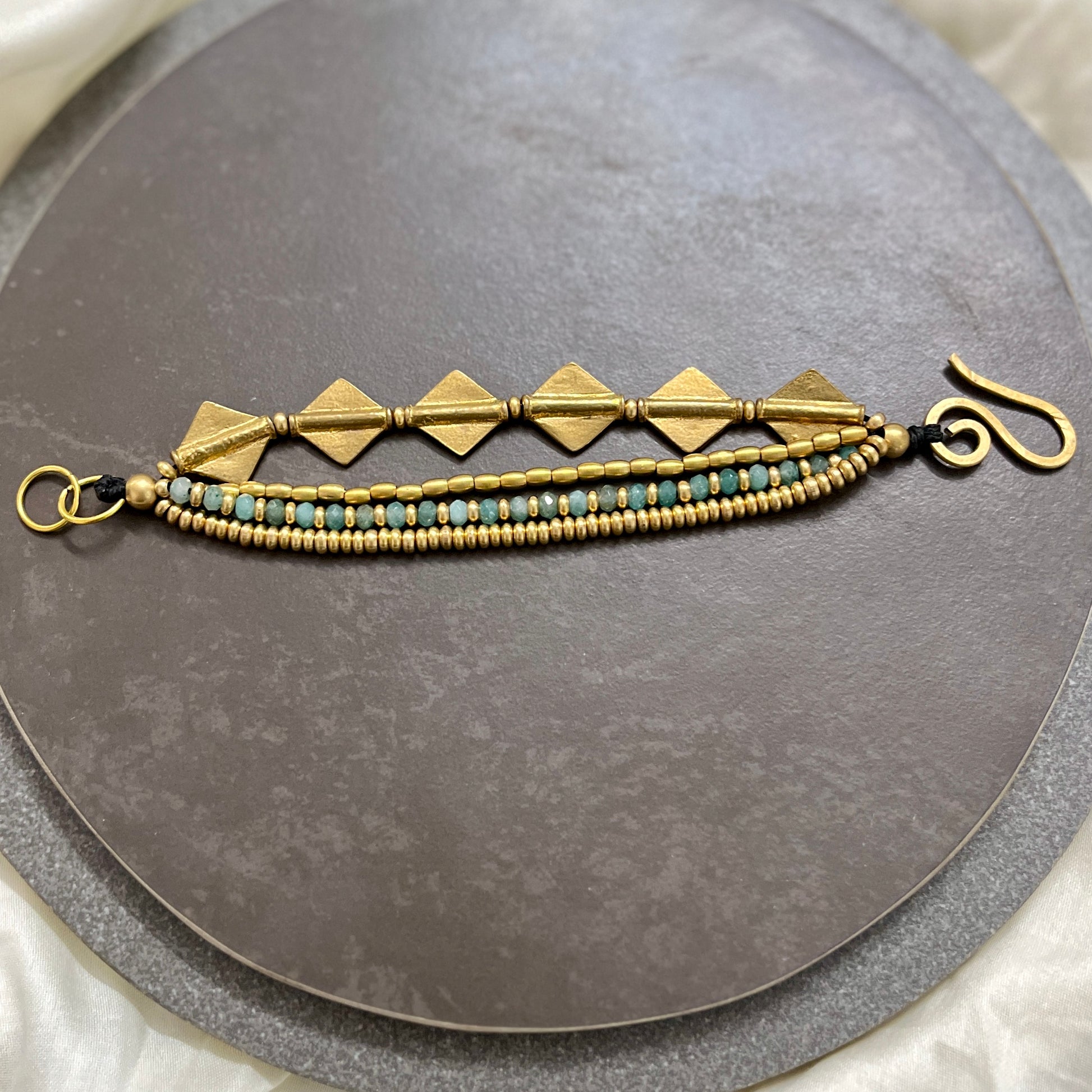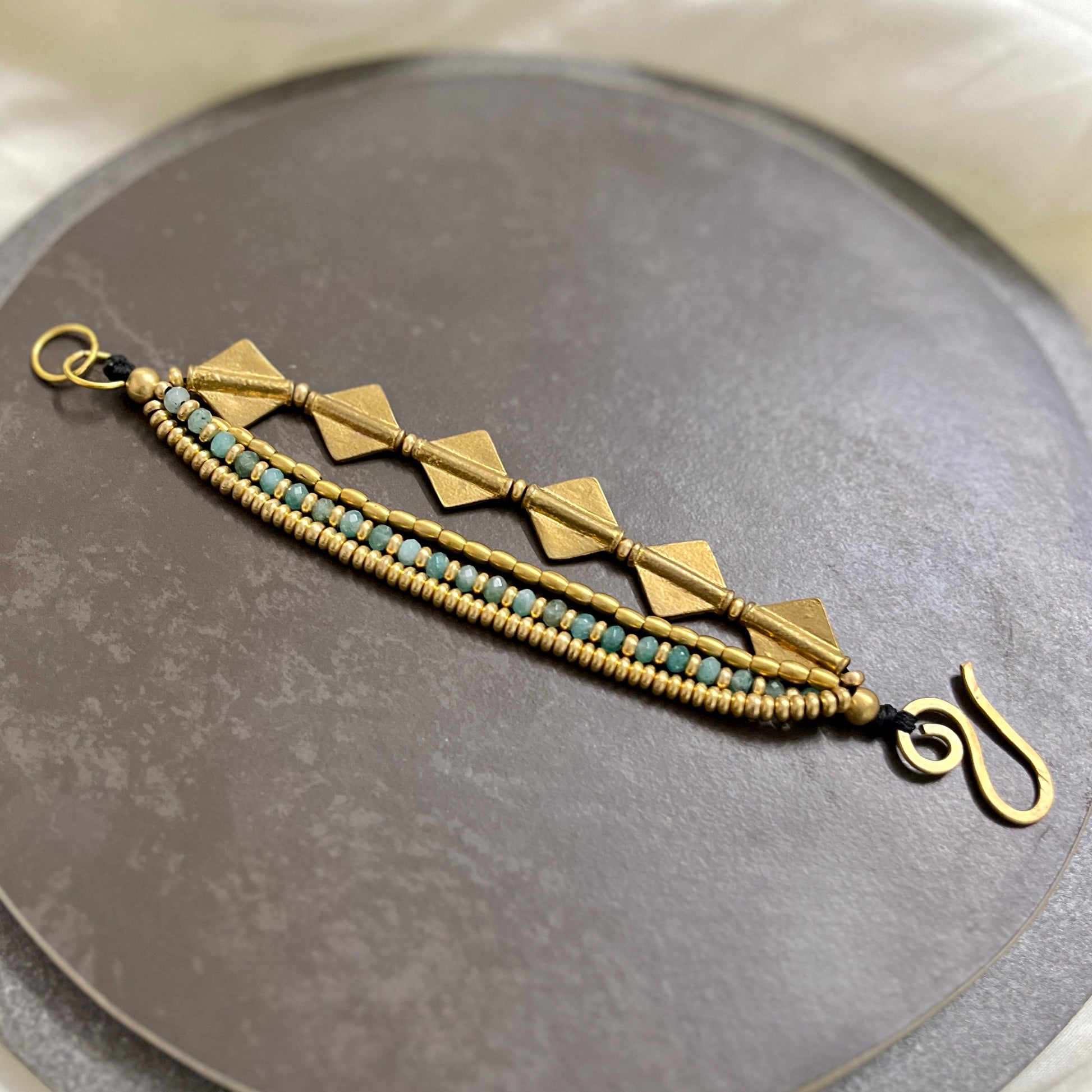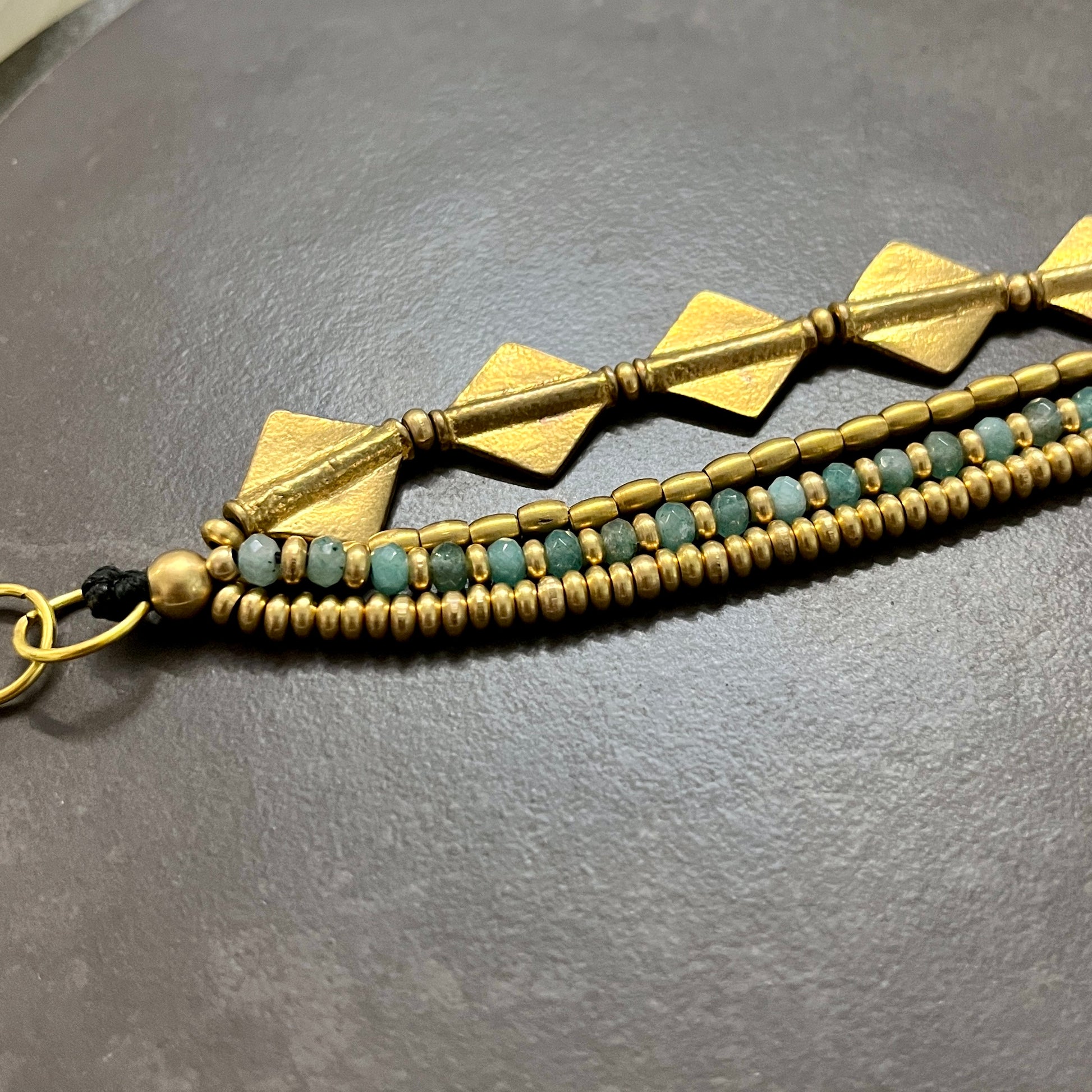 Handcrafted with aqua blue beads, brass beads and diamond charms.