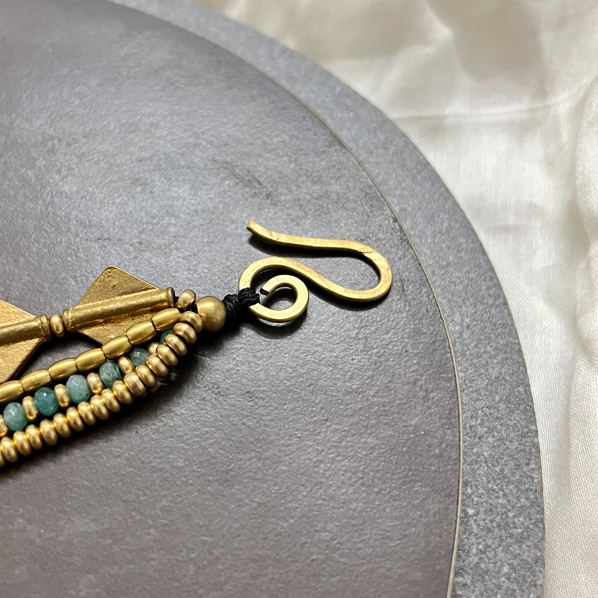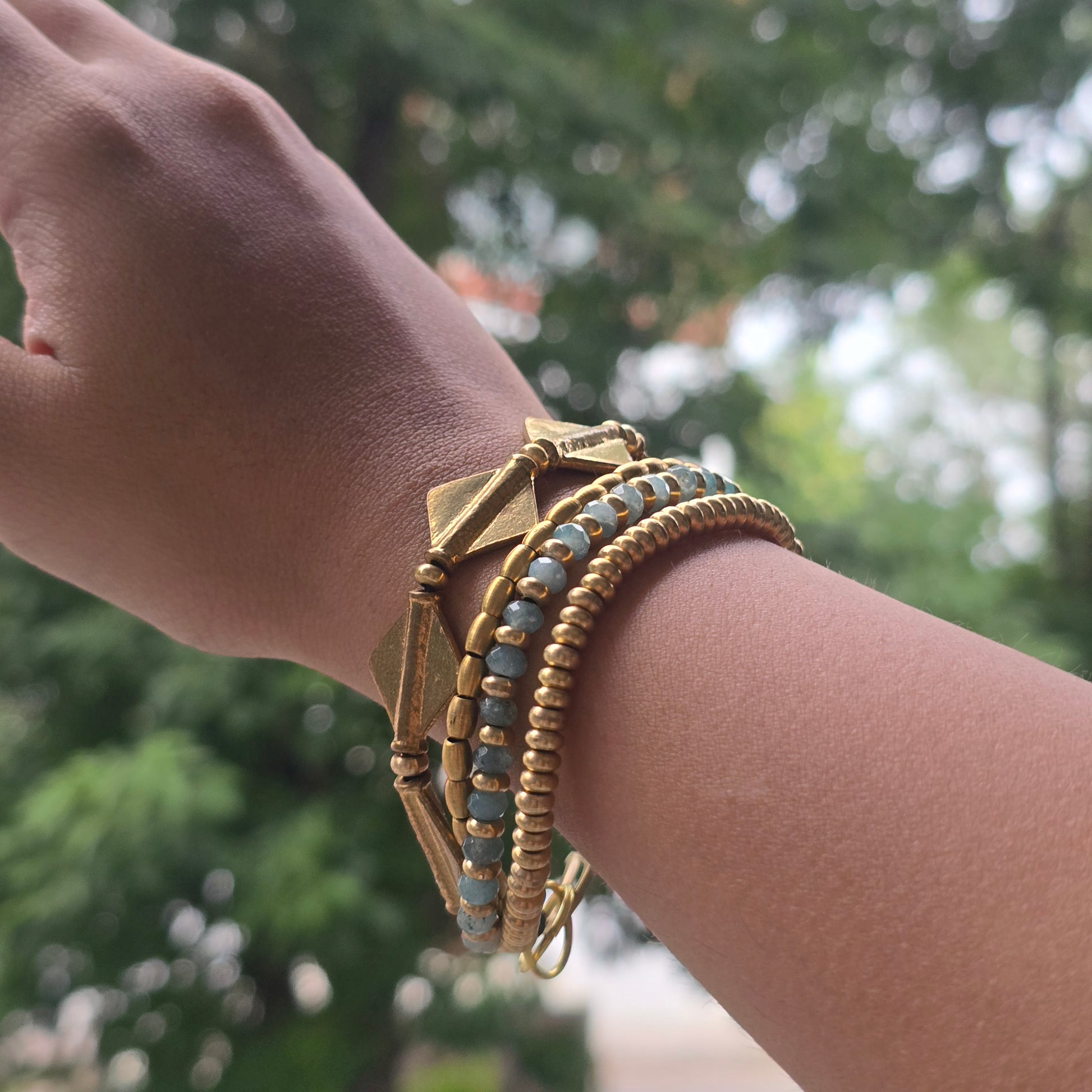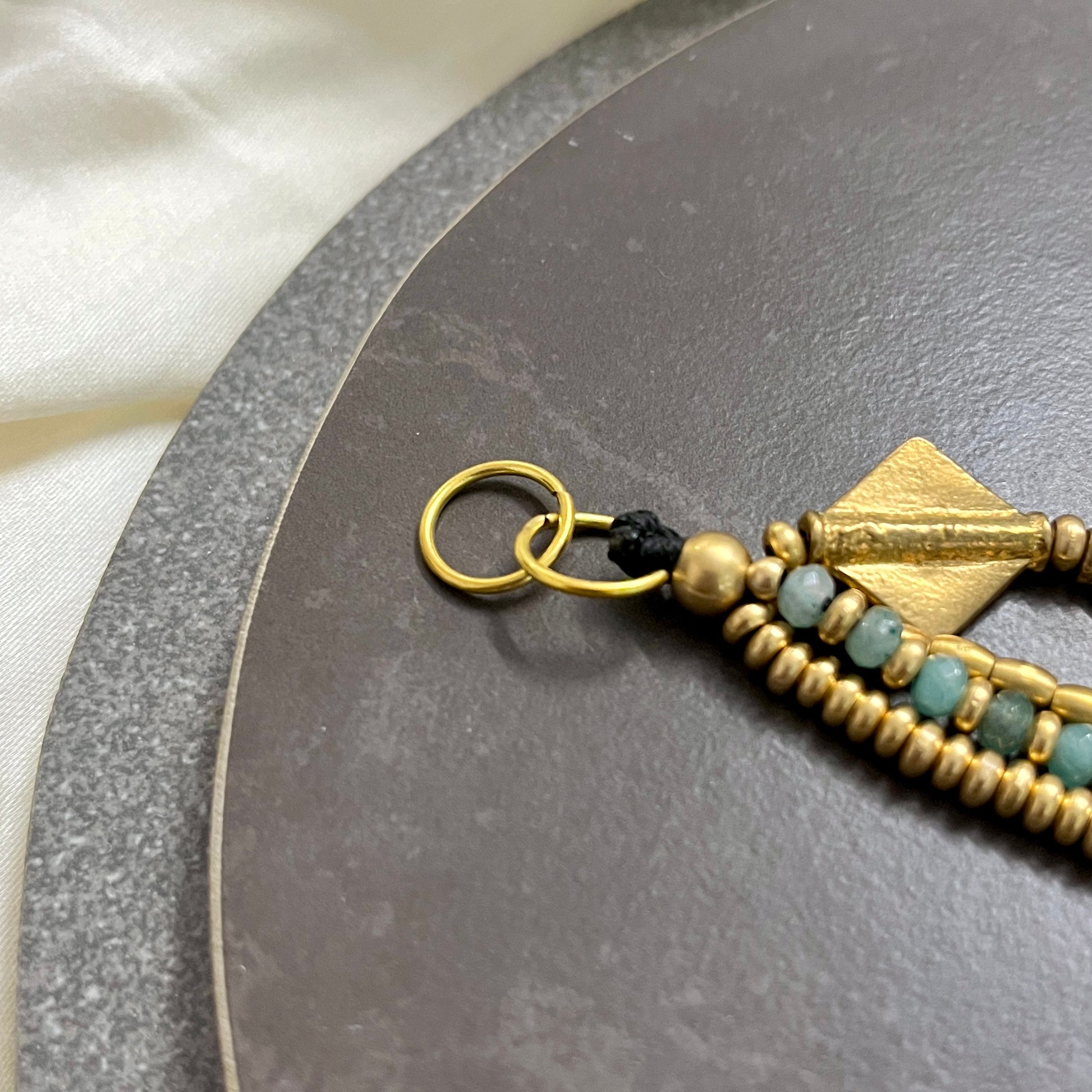 Handcrafted with aqua blue beads, brass beads and diamond charms.