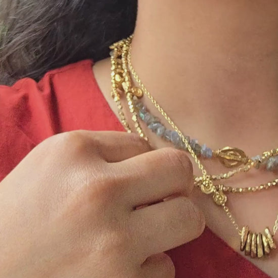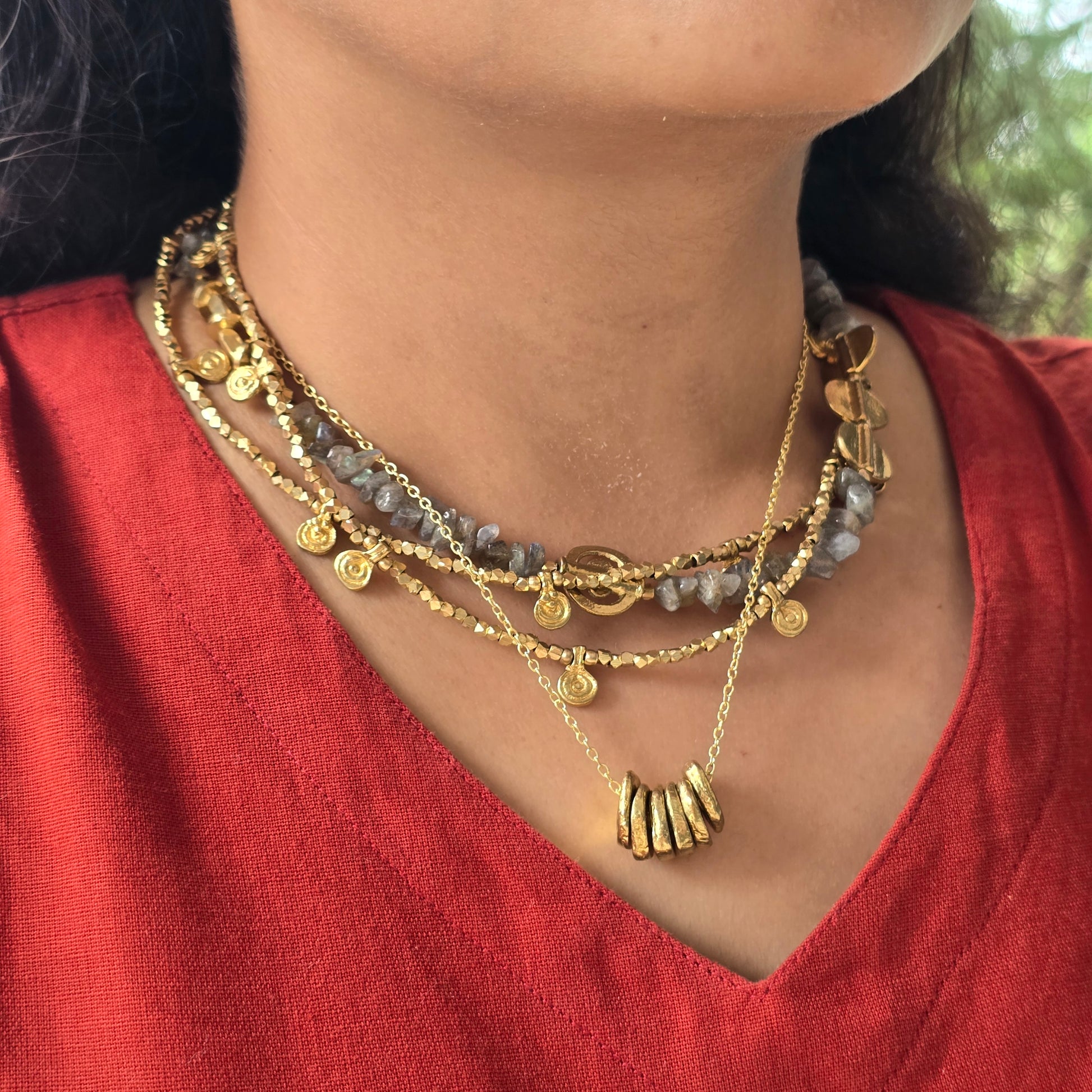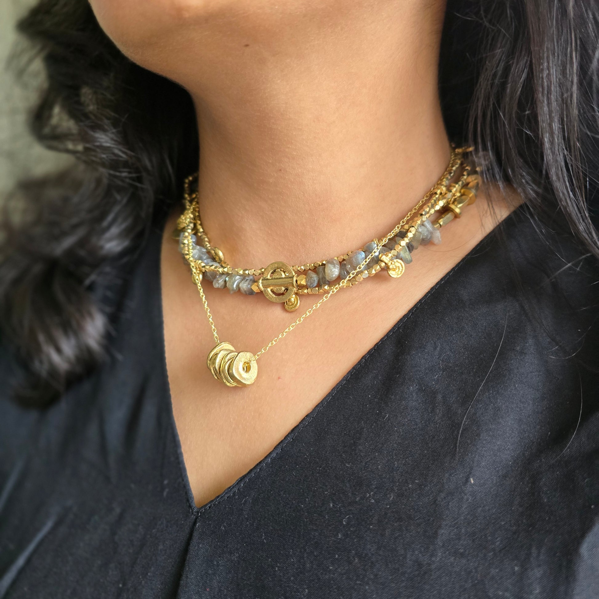 Showcases the stone’s natural iridescence paired with textured brass charms. The layered strands reflect light with every movement, evoking moonlit magic and inner strength. A versatile statement piece for the dreamer and the grounded soul alike.