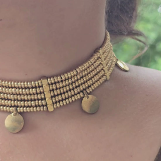 The necklace features rows of finely beaded detailing that create a bold yet elegant structure, adorned with dangling brass coin charms for a touch of movement and rustic charm. Perfect for pairing with both ethnic wear and contemporary outfits. A statement piece that beautifully blends heritage craftsmanship with modern aesthetics.