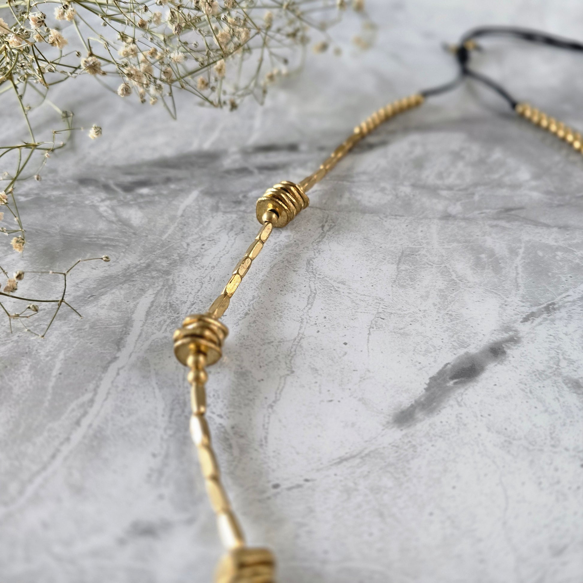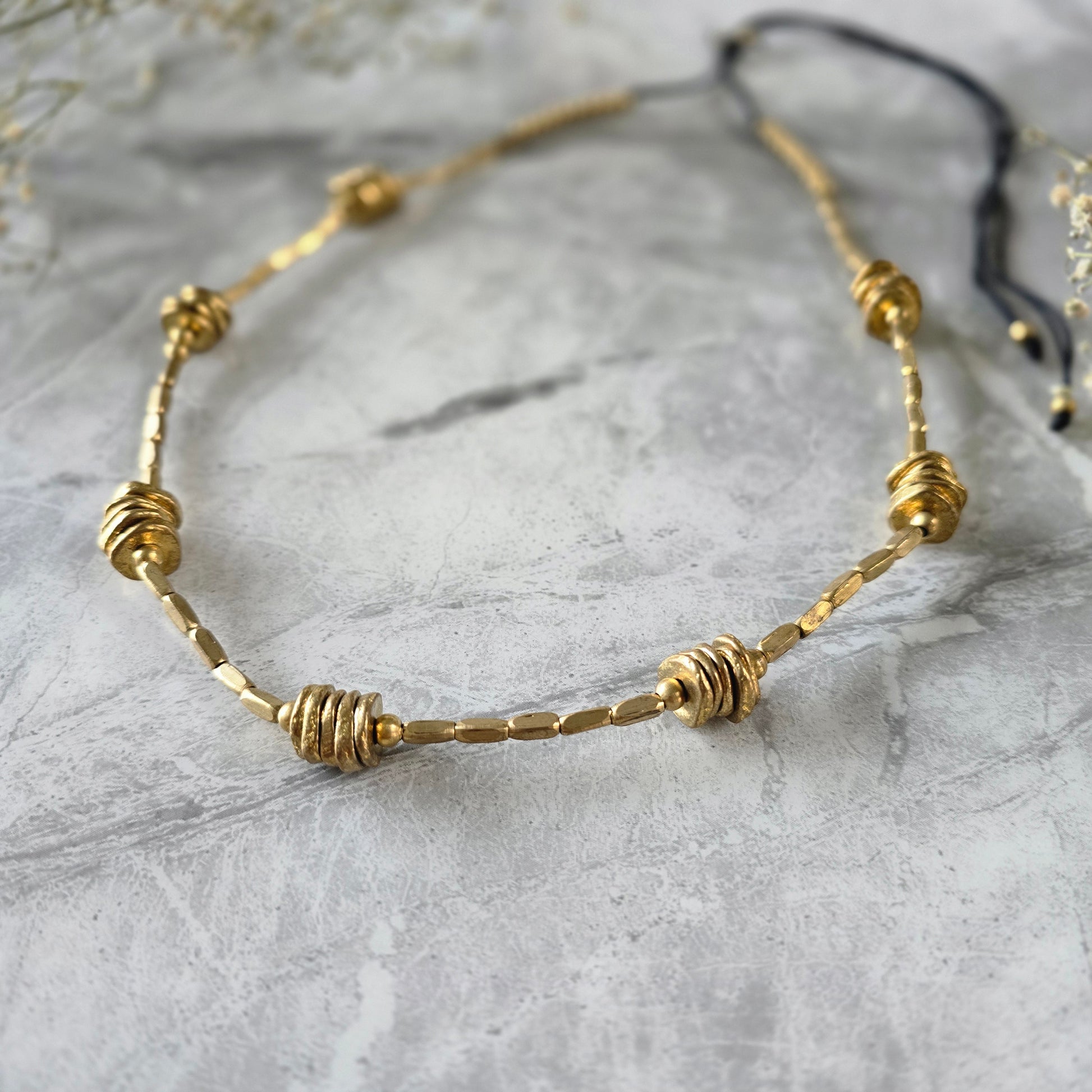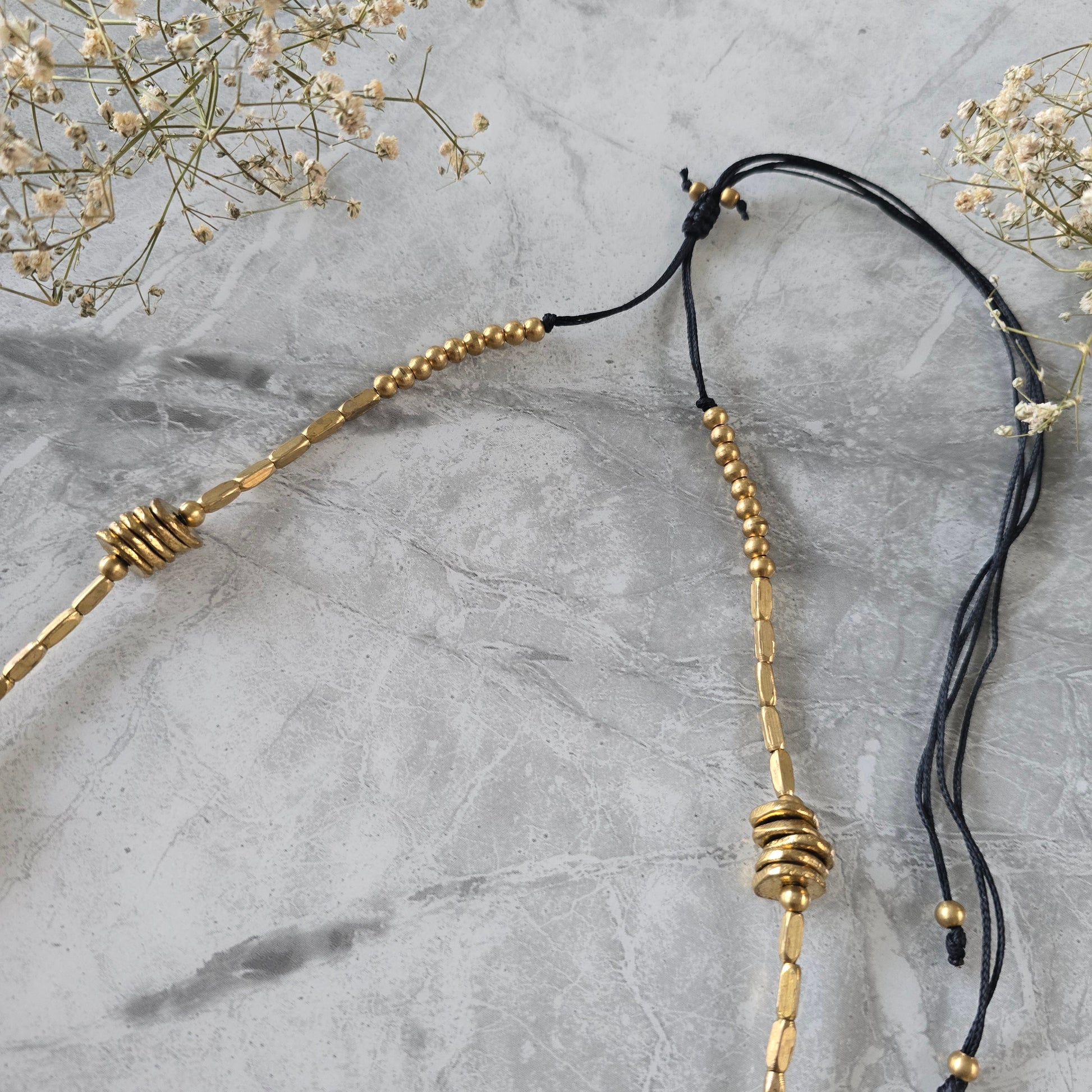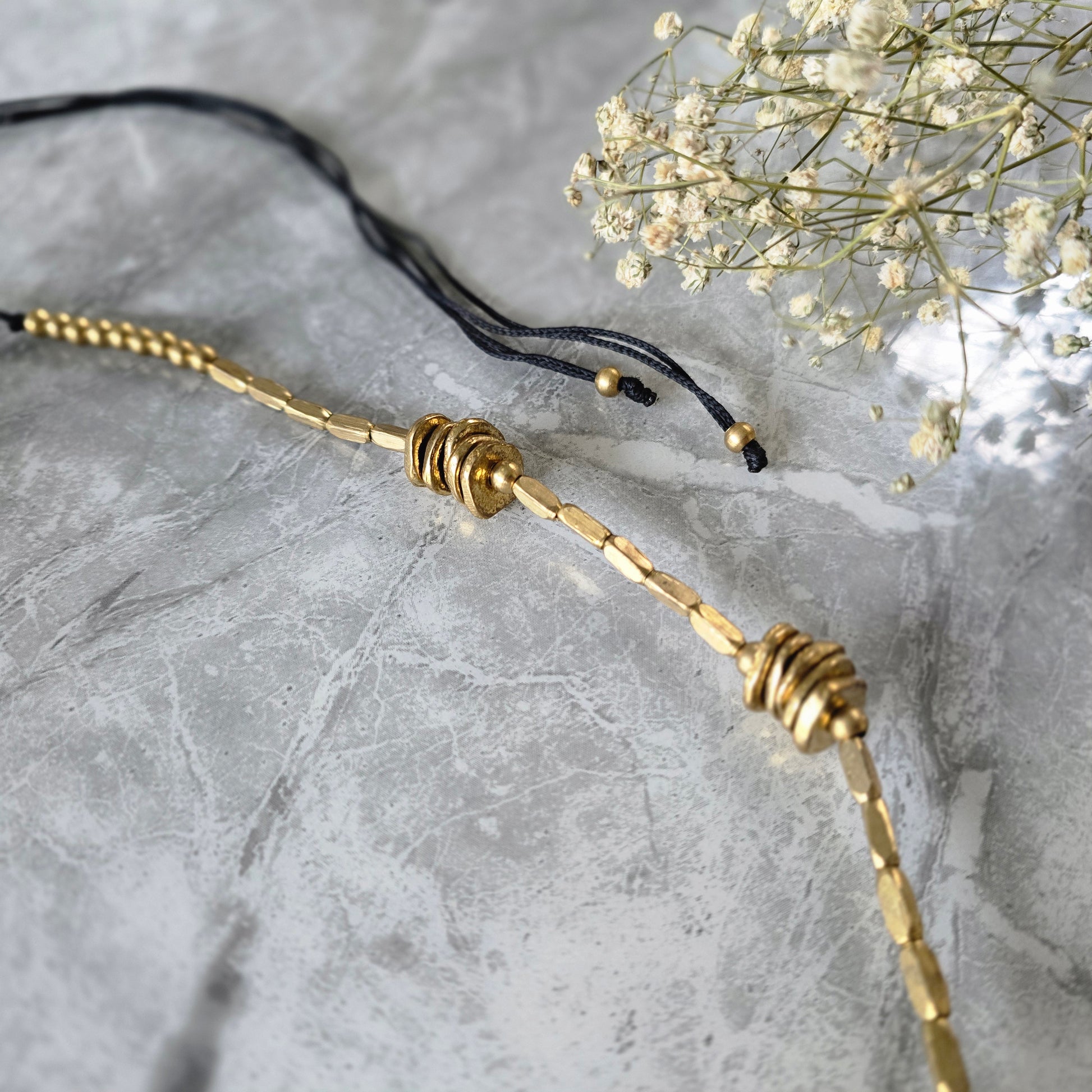 Necklace features clusters of stacked, coin-like brass elements woven into a sleek, elongated design. The hammered brass beads create subtle texture and depth, while the adjustable black cotton thread lends a relaxed, earthy finish.