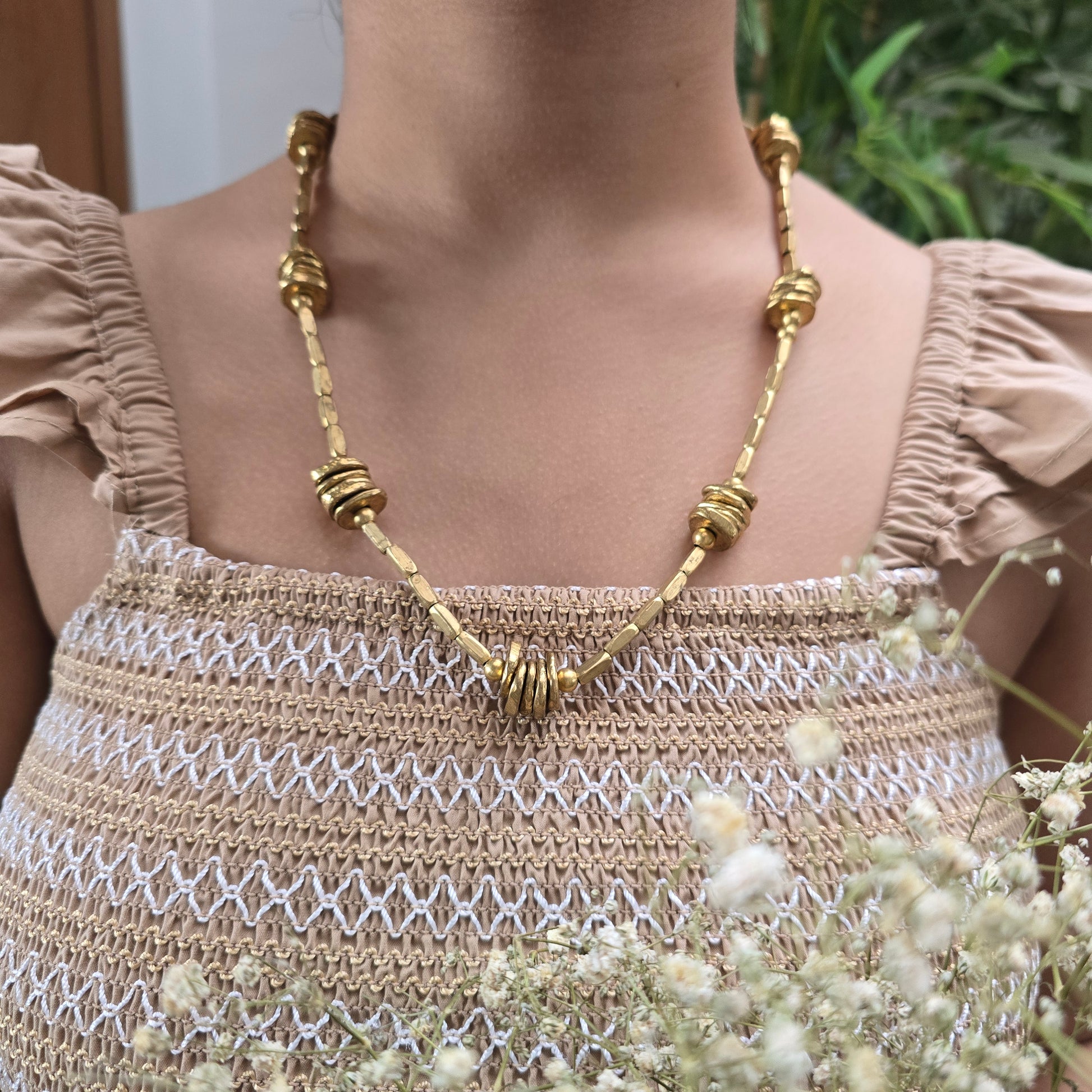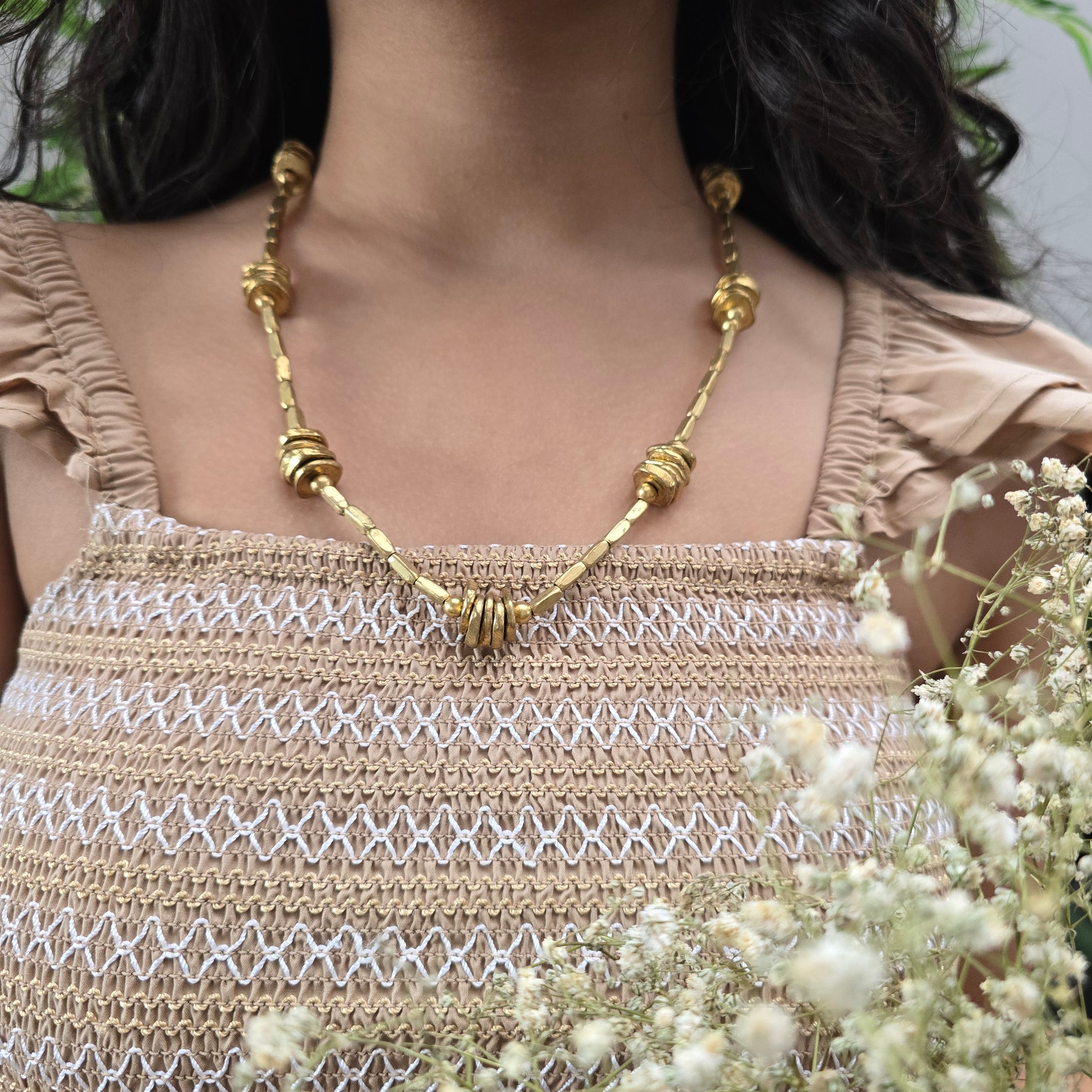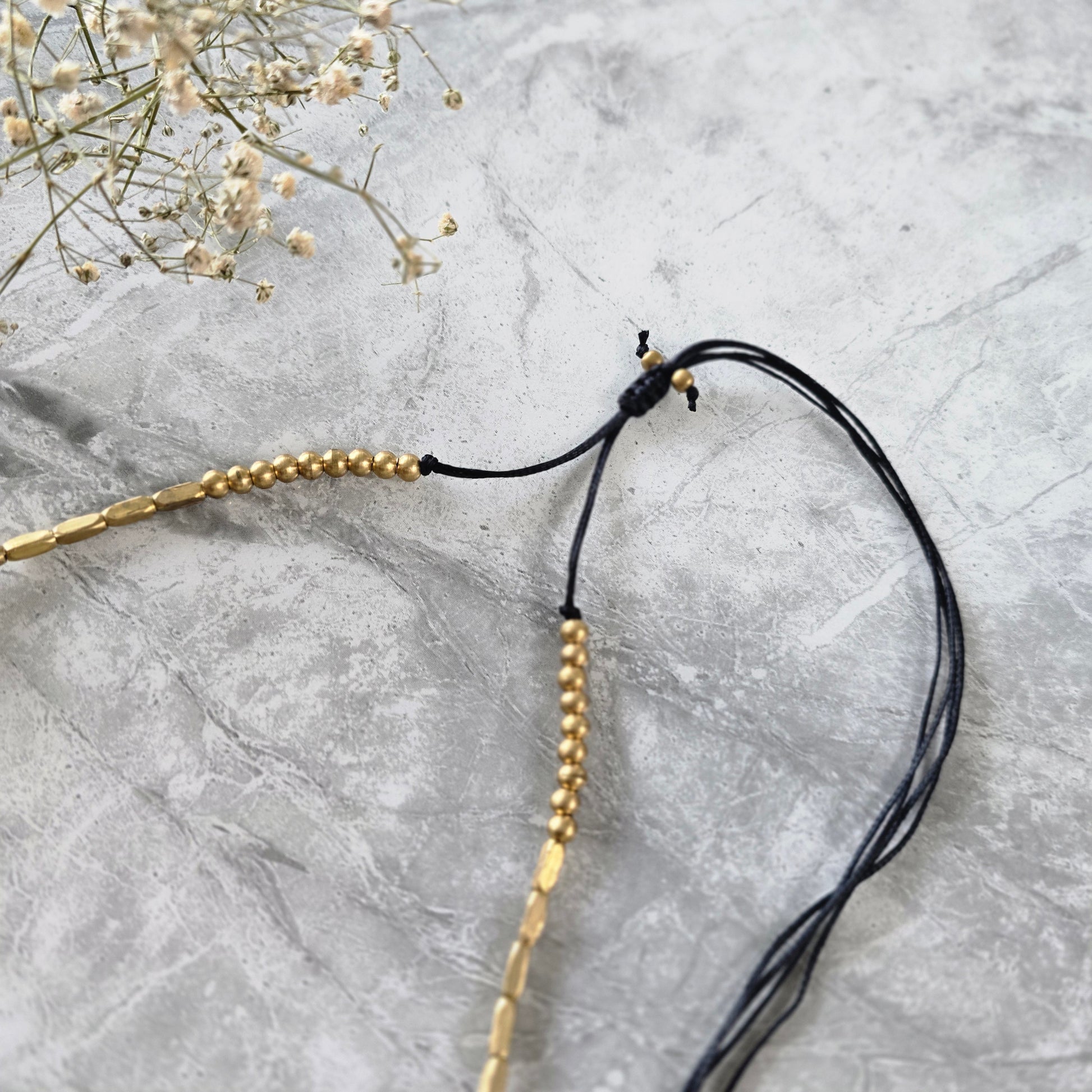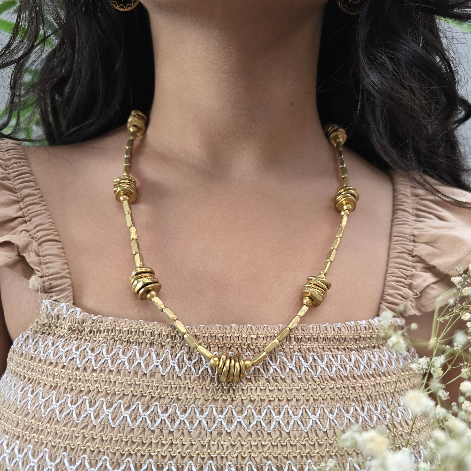 Necklace features clusters of stacked, coin-like brass elements woven into a sleek, elongated design. The hammered brass beads create subtle texture and depth, while the adjustable black cotton thread lends a relaxed, earthy finish.