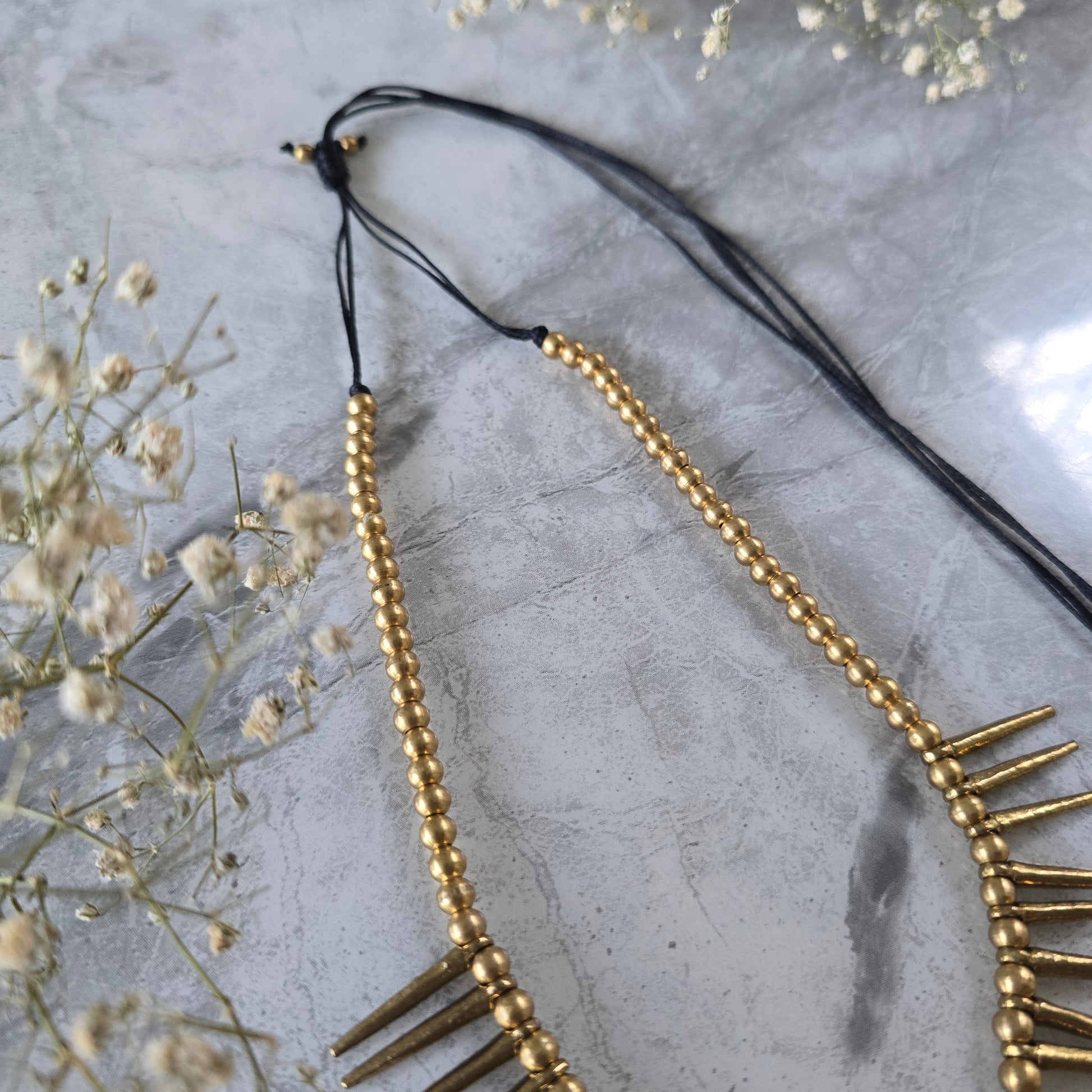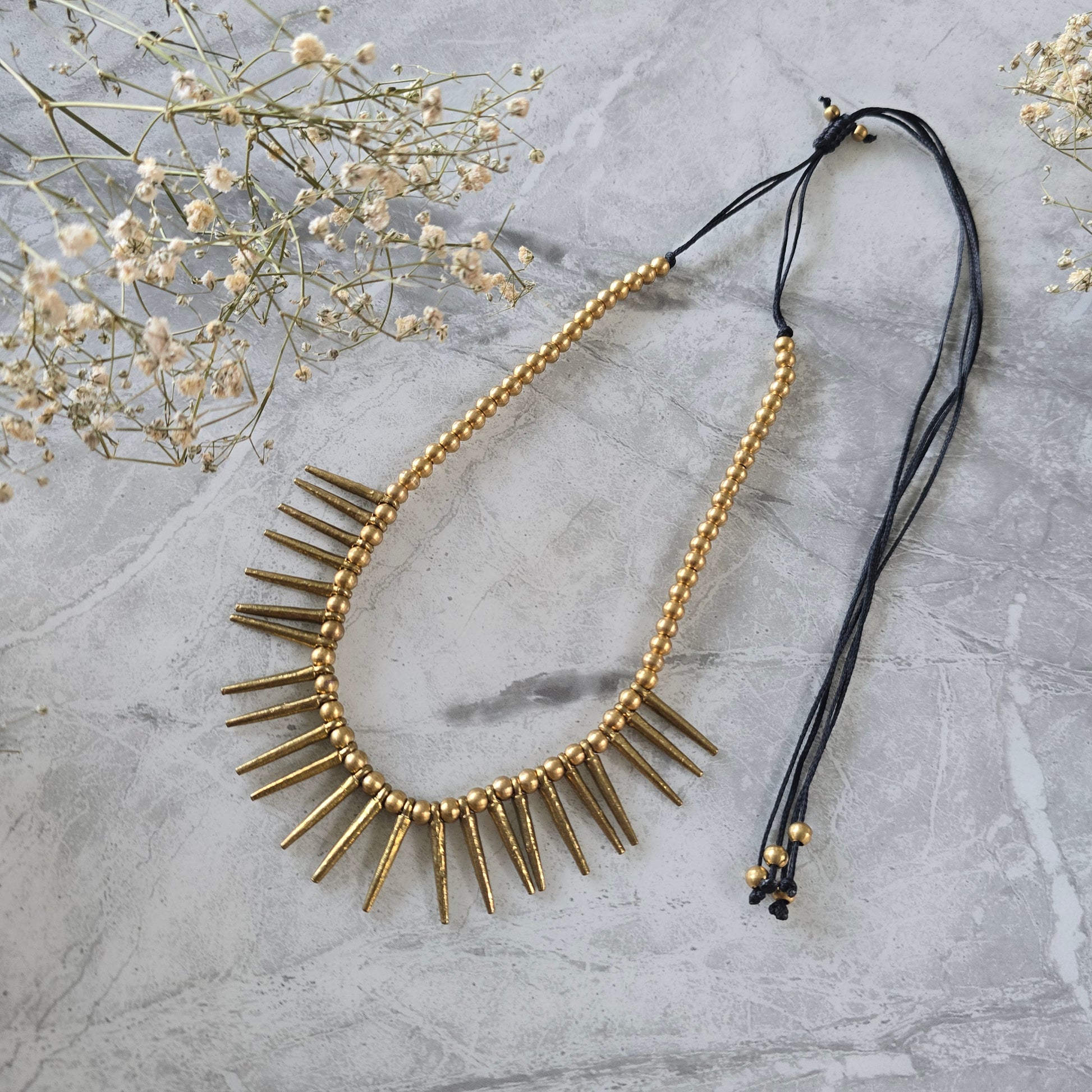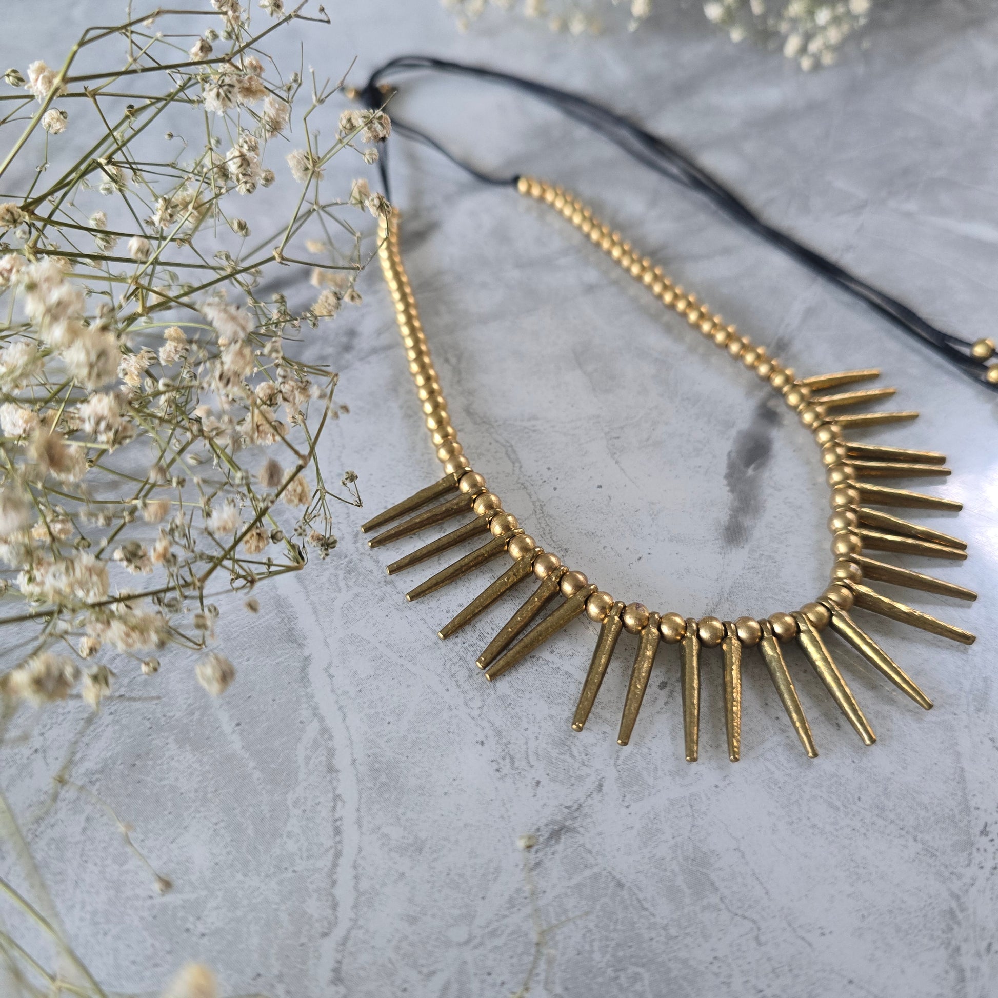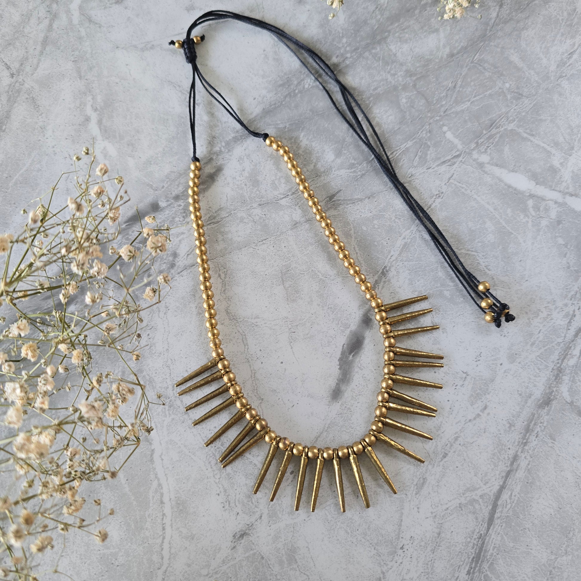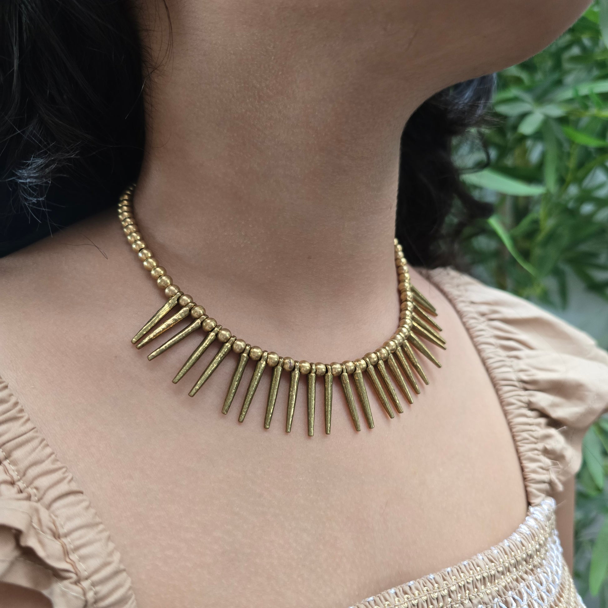 Crafted in pure brass, the necklace exudes an antique finish that only gets better with time. Its edgy silhouette pairs beautifully with both contemporary and boho-inspired outfits—perfect for statement layering or standing strong on its own.