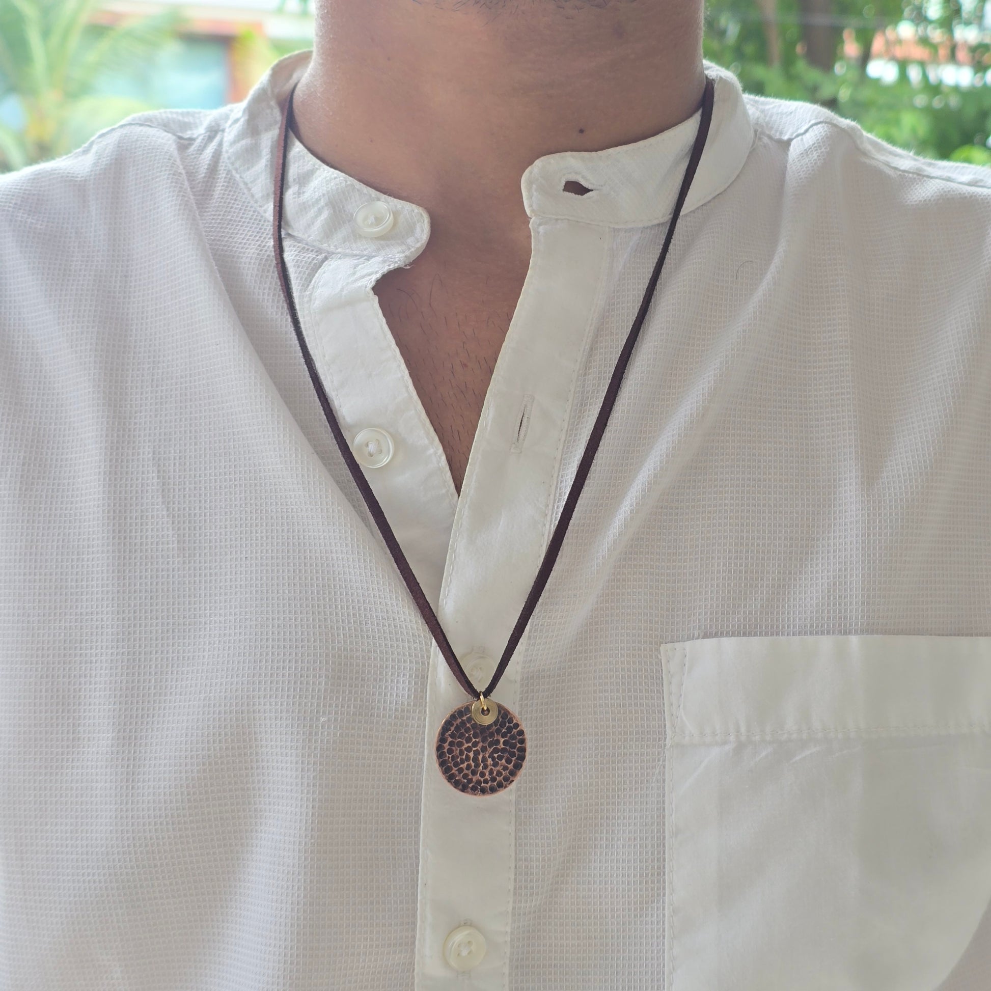 Warrior necklace is handcrafted from copper and brass with leather cord and pure brass clasps and jump rings.